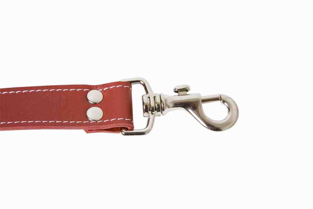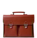 Two front pockets, one small document compartment and one large main compartment. Adjustable shoulder strap. Red leather with white stitching. A laptop up to 14" fit in.